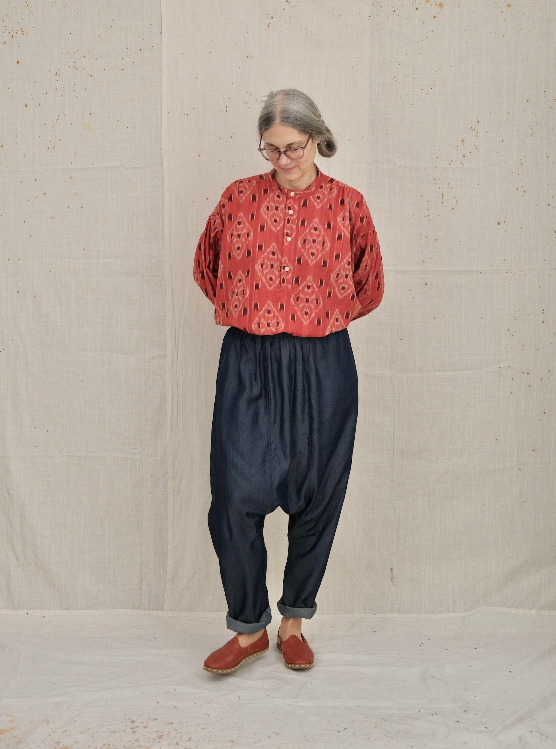 Drop crotch, roomy harem pant with on-seam pockets, and elasticized waist for a comfortable fit. Indigo 2x1 lightweight denim.