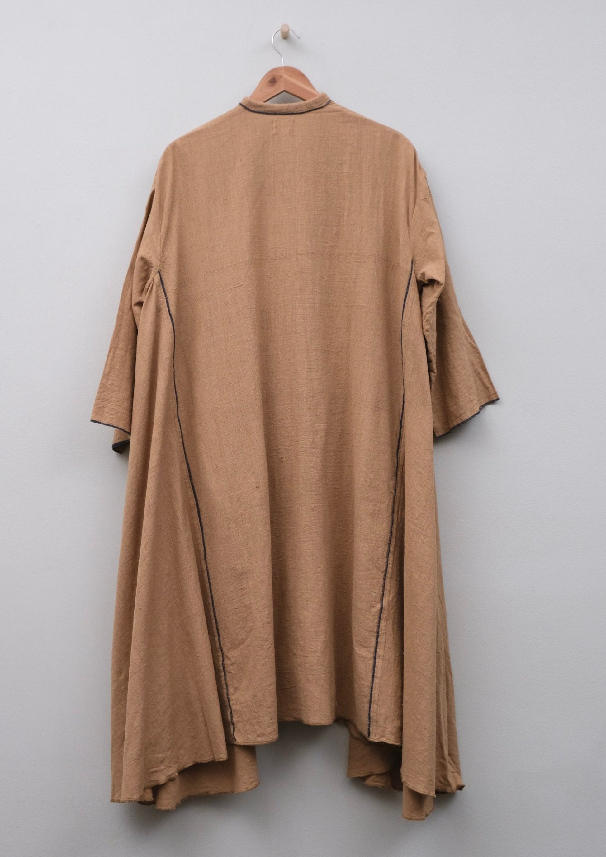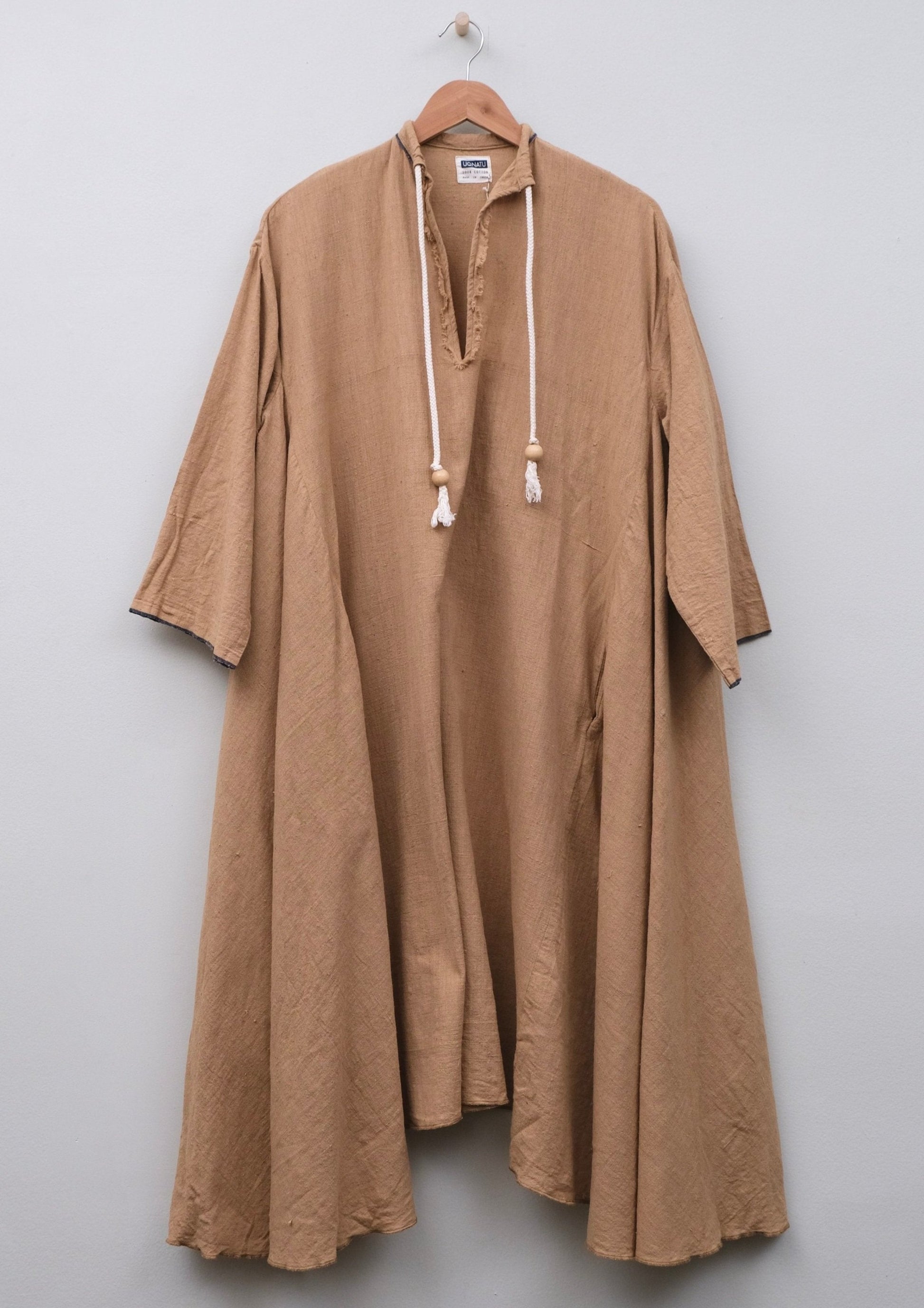 Full sweep, slit front dress with mid-length sleeves and on-seam pockets. Indigo selvage details at collar, sleeve opening, and back seams. Drawcord closure with wooden beads. Fabric is natural brown cotton handspun, hand-dyed, handwoven by artisans. Imperfections in the fabric are part of the charm. Voluminous fit. One Size.